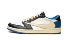 Das Obermaterial besteht aus hochwertigem weißem Leder mit königsblauen Überzügen an der Ferse und schwarzen Akzenten an der Zehenkappe, den Ösen und den Schnürsenkeln. Der umgekehrte Swoosh auf der Außenseite besteht aus cremefarbenem Leder , während der normale Swoosh auf der Innenseite in Schwarz gehalten ist – ein typisches Travis-Detail. Die segelfarbene Zwischensohle verstärkt den Vintage-Look, während die königsblaue Außensohle für Farbkontrast und Halt sorgt.