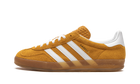 Het bovenwerk is vervaardigd uit premium suède in een opvallende, heldere kleur die direct in het oog springt. De contrasterende witte leren Three-Stripes en hieltab zorgen voor een frisse look, terwijl de gumrubberen indoorzool zorgt voor optimale grip en wendbaarheid. De subtiele goudkleurige "Gazelle"-branding maakt het design compleet met een elegante touch.