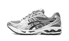 Het bovenwerk bestaat uit zilver metallic mesh en synthetische overlays, met opvallende accenten in Jasper Green op de ASICS-strepen, hiel en tong. Deze kleur geeft het technische ontwerp een elegante en verfijnde uitstraling, perfect te combineren met zowel sportieve als casual fits.