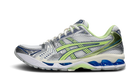 Het bovenwerk bestaat uit een wit/lichtgrijze meshbasis, gecombineerd met metallic zilveren overlays die een koele tech‑vibe uitstralen. De eyecatcher? Lime‑groene (Sprite‑groen) accenten op de ASICS‑strepen en de binnenvoering, als een energieke knipoog. Koningsblauwe (royal blue) GEL‑capsules in de midsole vormen samen met de zilveren basis een fris en opvallend contrast. Off‑white middenzool voegt een licht verouderde look toe—een subtiele retro‑twist binnen een futuristische flow.