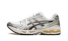 Het bovenwerk is opgebouwd uit ademend mesh in wit, aangevuld met synthetische overlays in metallic silver die het gelaagde, sportieve ontwerp van de Kayano 14 benadrukken. De highlight zit in de energieke Tai Chi Yellow details, die terugkomen op de ASICS-strepen, hiel, tong en voering. Deze zonnige kleur geeft de schoen een opvallend maar gebalanceerd karakter — fris, maar niet te fel.