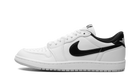 Het bovenwerk bestaat uit hoogwaardig leer met een metallic zwarte finish, aangevuld met klassieke witte panelen en subtiele zwarte details. De iconische Swoosh en het Jordan Wings-logo onderstrepen de authenticiteit van het model, terwijl het Jumpman-logo op de tong de moderne finishing touch toevoegt.